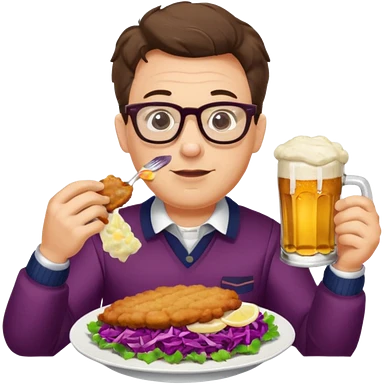 Man with glasses german eating schnitzel, red cabbage, sauerkraut, potato salad, and beer emoji