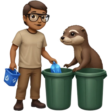 an otter disguised as a man picking up trash bins, next to a mad scientist emoji