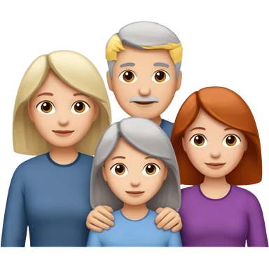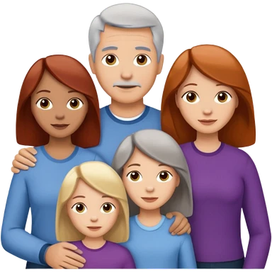 Family emoji showing a family of five. Father has grey hair, mother has mixed grey/brown hair, three daughters with blonde, brunette and redhead hair colors. emoji