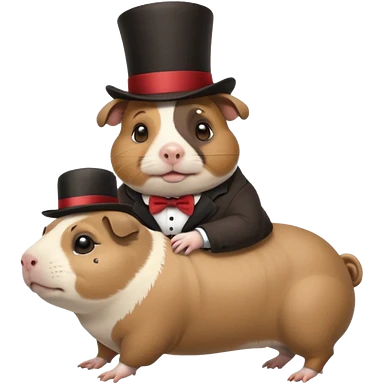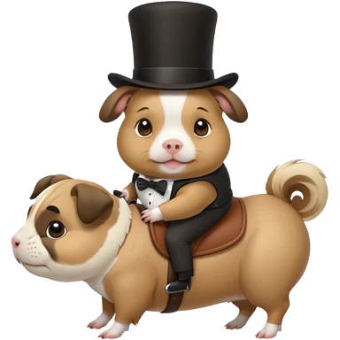 a cute guinea pig wearing a top hat riding on the back of a chubby pug emoji