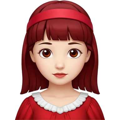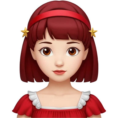 فرشته با موی چتری و لباس قرمز و موی خرمایی تیره و سربند یاقوت و الماس emoji | AI Emoji Generator