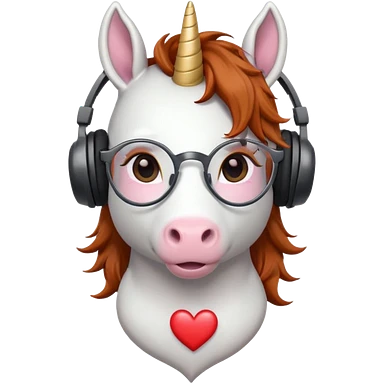 headphone wearing white unicorn with dark ginger hair and heart shaped spectacles emoji