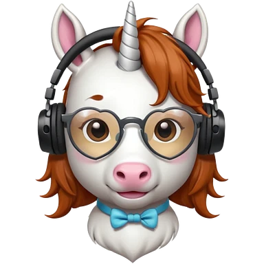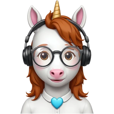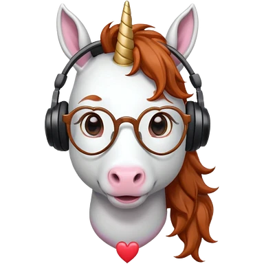 headphone wearing white unicorn with dark ginger hair and heart shaped spectacles very unicorn looking emoji