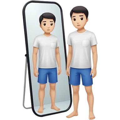 A young Asian guy is sadly examining his body in a full-length mirror. emoji