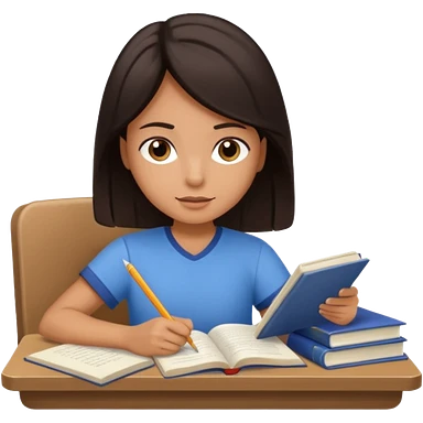 A student with dark hair is reading a book and taking notes in a notebook. There are also papers and textbooks on the table. emoji