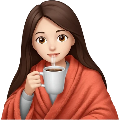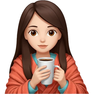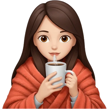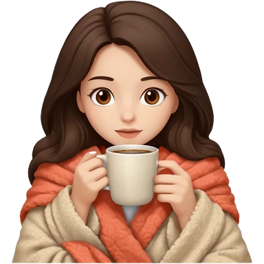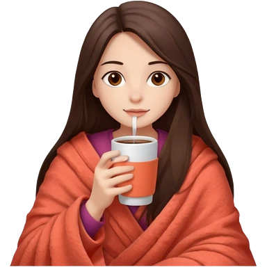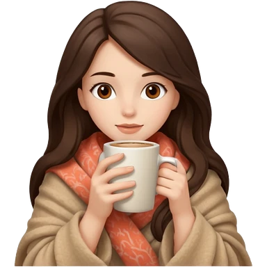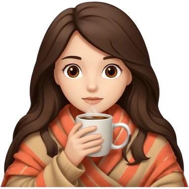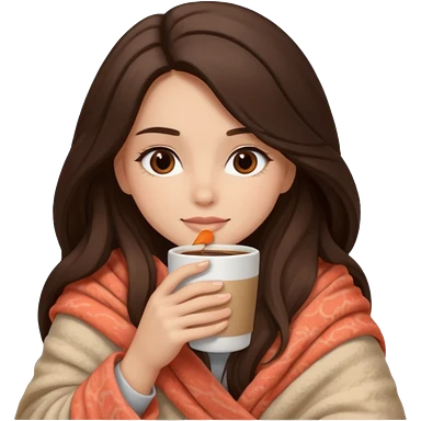 Девушка брюнетка с длинными волосами, костями глазами укутана в пушистый плед бежевого цвета и пьет кофе. Картинка должна были в цветах: бежевый, коралловый и коричневый emoji