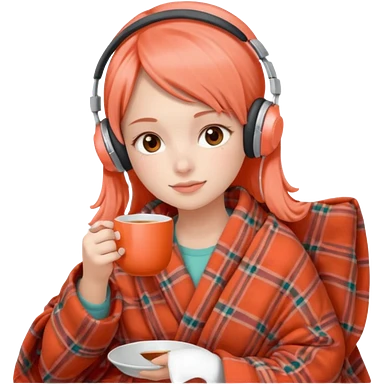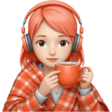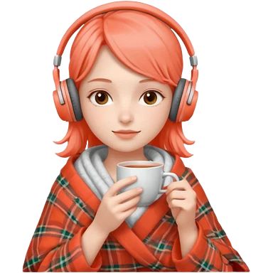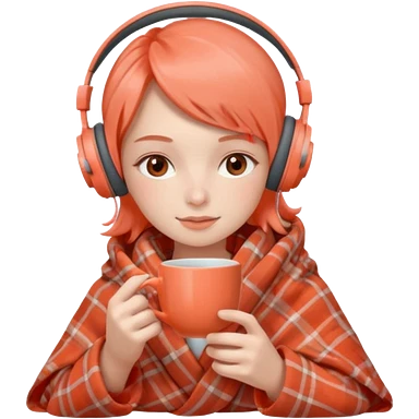 Девушка в пледе кораллового цвета пьет чай и на ней наушники emoji