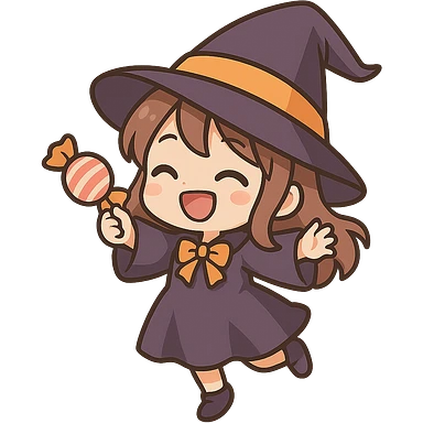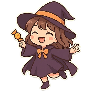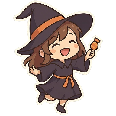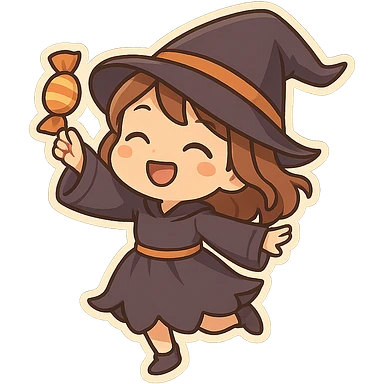 一个穿着万圣节巫师服装的小女孩,手里拿着一个糖果,开心的跳舞 emoji