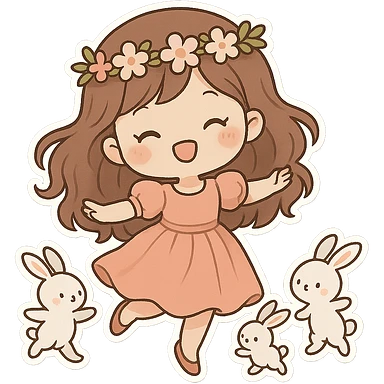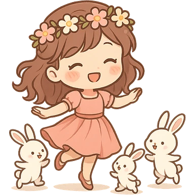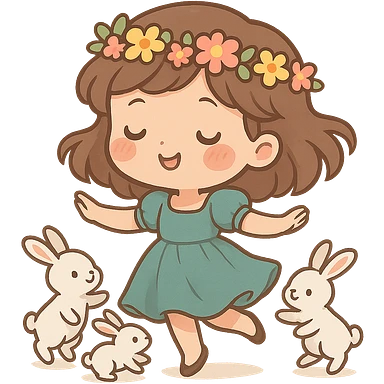 一个可爱的小女孩,穿着漂亮的裙子,头顶戴着花环,正在和几只小兔子跳舞 emoji