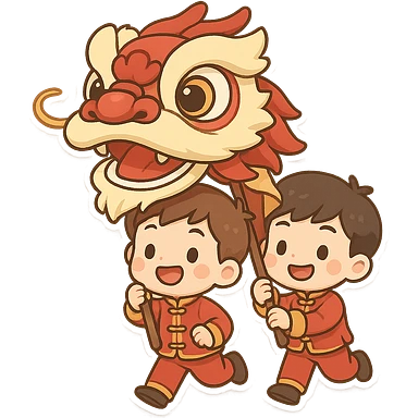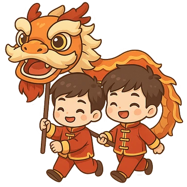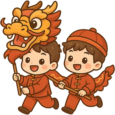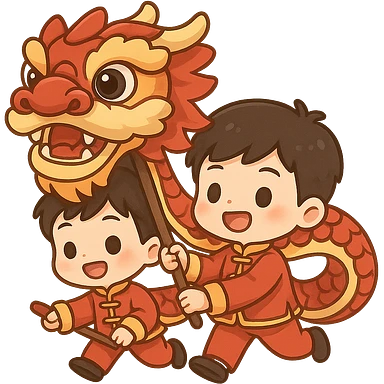 两个可爱的男孩穿着新年的衣服,正在舞龙 emoji