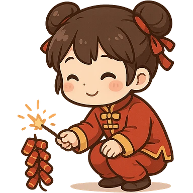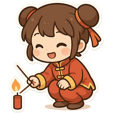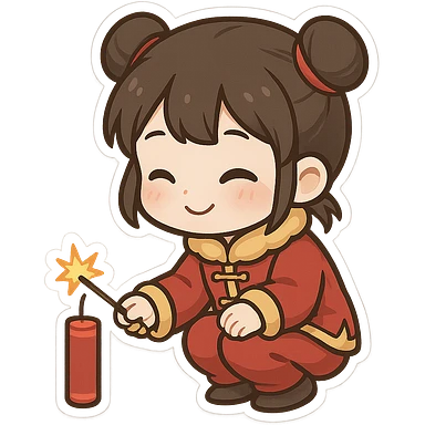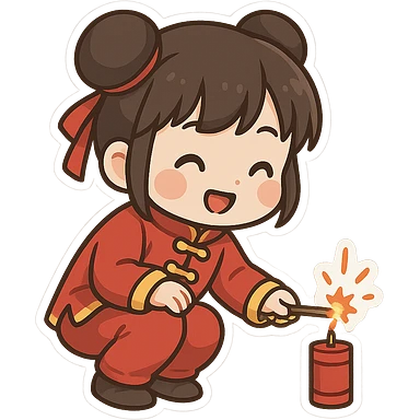 一个可爱的小女孩身穿着新年服装,蹲着点炮竹 emoji