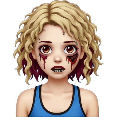 Crie um emoji de uma garota zumbi, como esta: "🧟♀️'. Porém invés da camiseta, uma regata fina e de cor preta, os cabelos loiros escuros na altura do ombro e picotado, liso na raiz e cacheado nas pontas, com mechas azuis na frente e a parte de trás pintada de vermelho vinho emoji