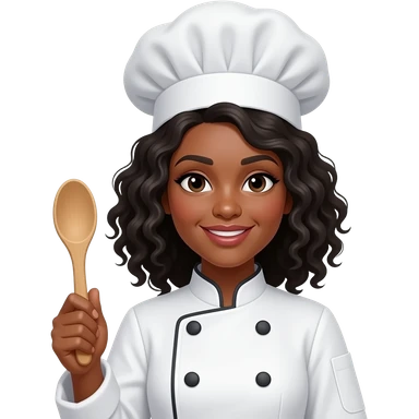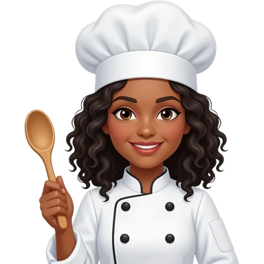 A medium-dark skinned woman with shoulder-length curly black hair dressed as a kitchen chef, holding a wooden spon emoji