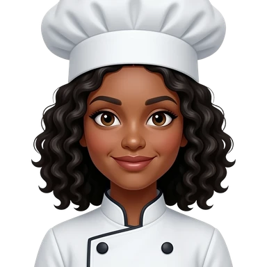 A medium-dark skinned woman with shoulder-length curly black hair dressed as a kitchen chef emoji