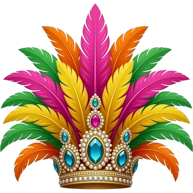 Jamaican carnival feather headpiece, extravagant crown made of long colorful feathers (bright neon pink, orange, yellow, green), decorated with jewels and rhinestones, flat lay on white background, no person, no model, sticker style, emoji style, 1:1 emoji
