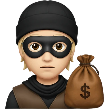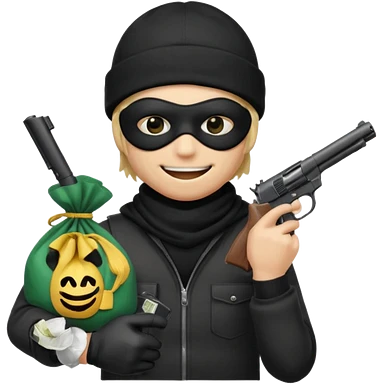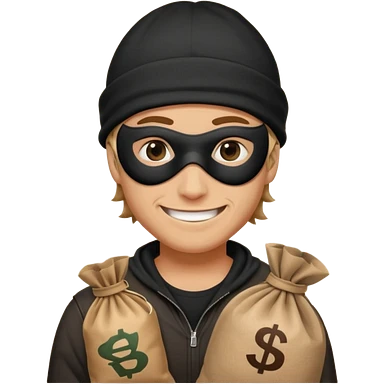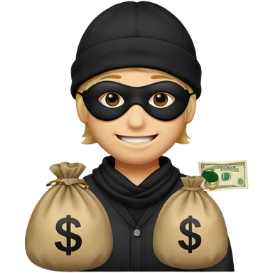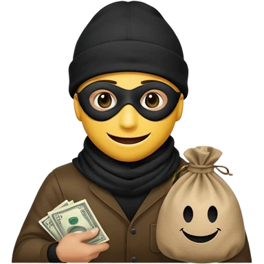 robber wears black eye mask and black beanies with money bag beside him emoji