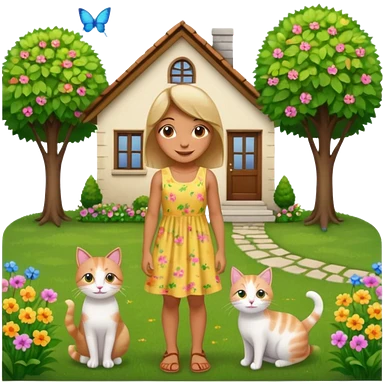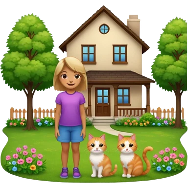 Девушка купила дом и стоит на фоне дома. Вокруг участок, деревья, зелень, цветы, кот emoji