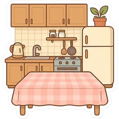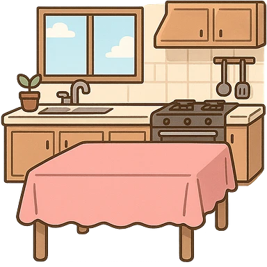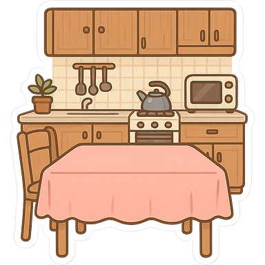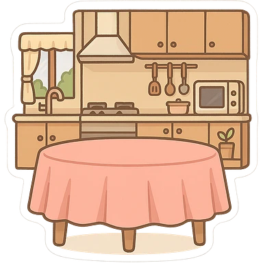 一个温馨的厨房,厨房前景是一个摆放着一个大的粉色桌布的餐桌 emoji