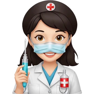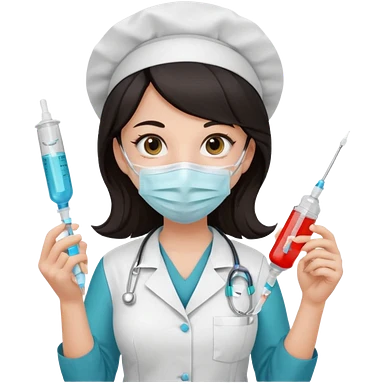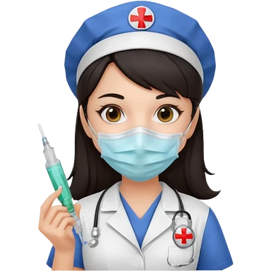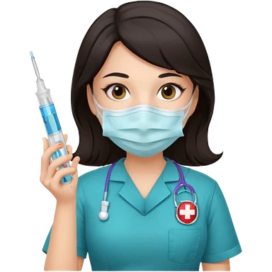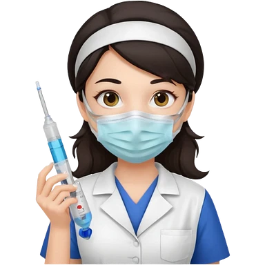ی دختر با روپوش پرستاری و ماسک موی مشکی و امپول ب دست emoji