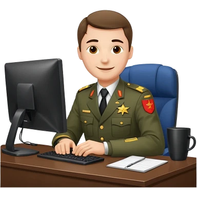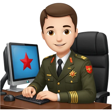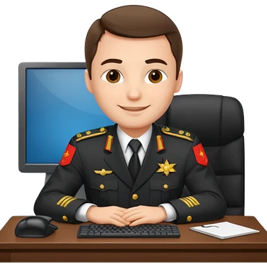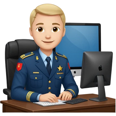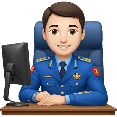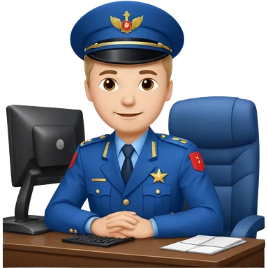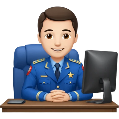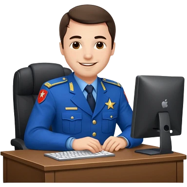 Мужчина в российской прокурорской форме, сидит за компьютером с улыбкой (синяя форма) emoji