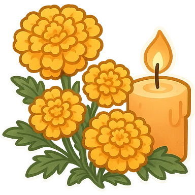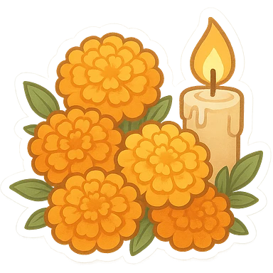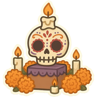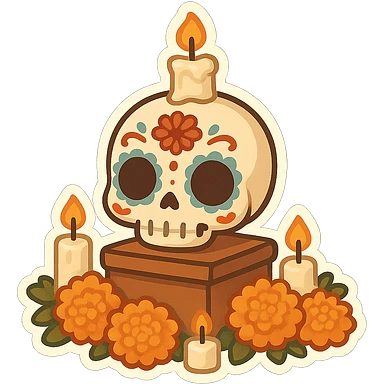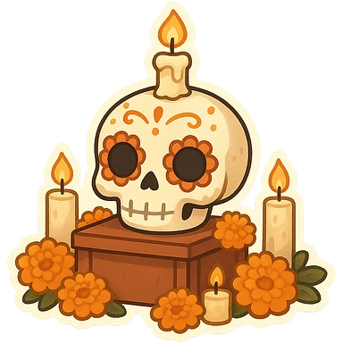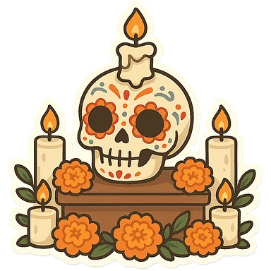 一个亡灵节的台子,台子周围是一些万寿菊和蜡烛,台子上面是一个带有亡灵节妆容的骷髅头,头顶上有一个蜡烛 emoji
