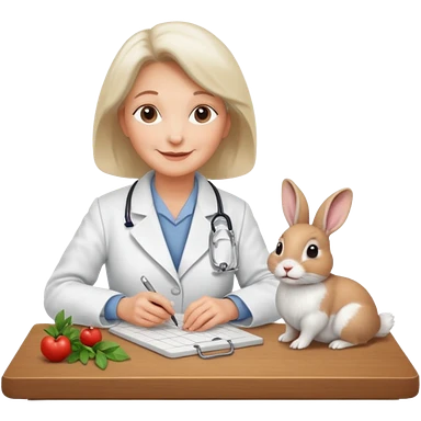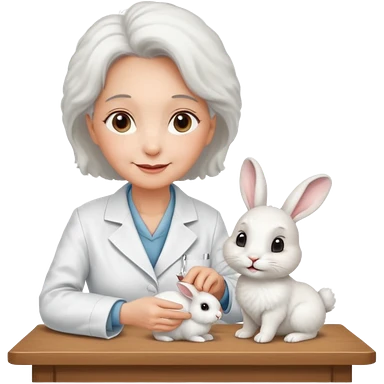 Older female vet – gentle smile, coat, checking rabbit on table. emoji