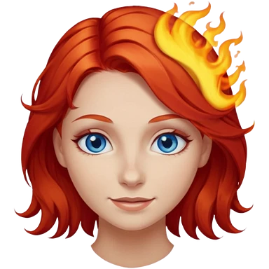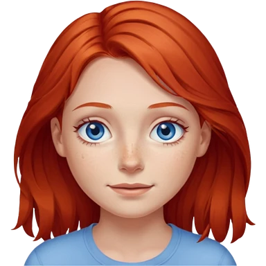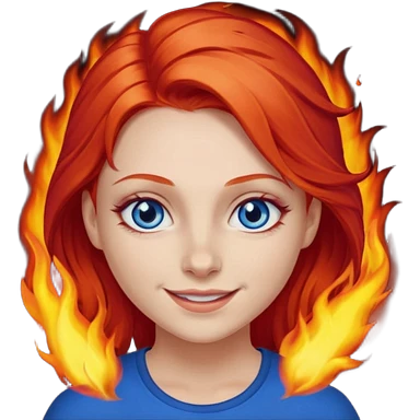 A girl with flaming red hair and intense blue eyes. Delicate dark circles under her eyes give her a slightly tired look, and her smile belies any fatigue. emoji
