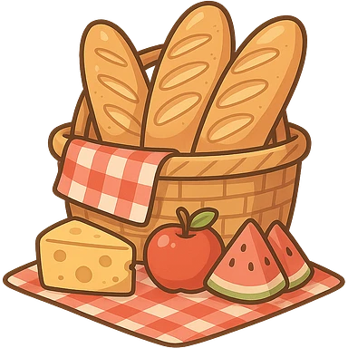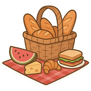 一些野餐的食物,一个餐篮子,里面放着许多面包 emoji