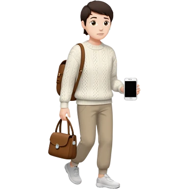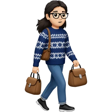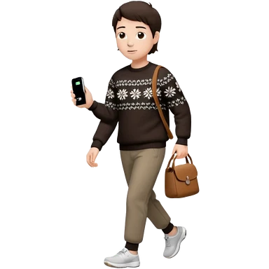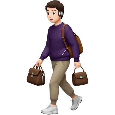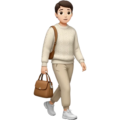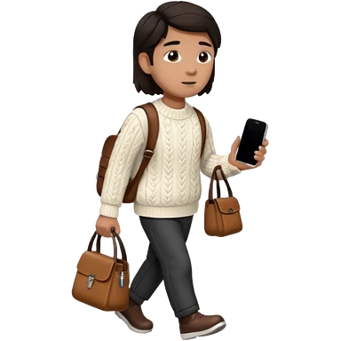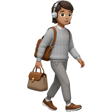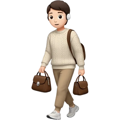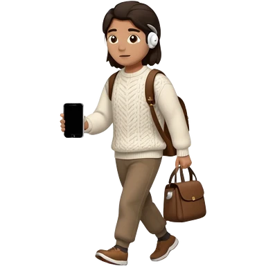 걷고 있는 사람 옷은 겨울에 어울리는 니트와 하의를 입었고 숄더백을 매었다. 머리카락 색깔은 어두운 갈색, 풀은 긴머리를 하고 있다 귀에는 애플의 에어팟이 착용되어 있다 emoji
