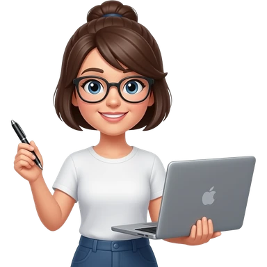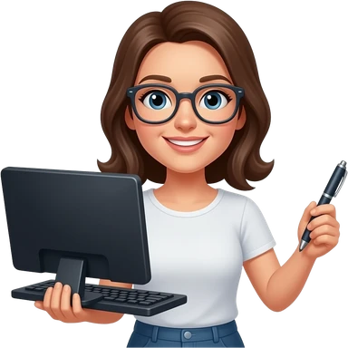 컴퓨터와 펜을 각각 양손에 든 안경쓴 여자 이모티콘 emoji