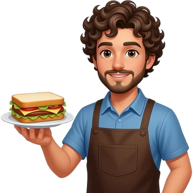 Un garçon bronze avec bouc et Moustache les cheveux bouclés serveur pas habiller en noir mais normzle qui sert un tasty crousty emoji