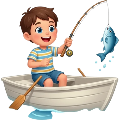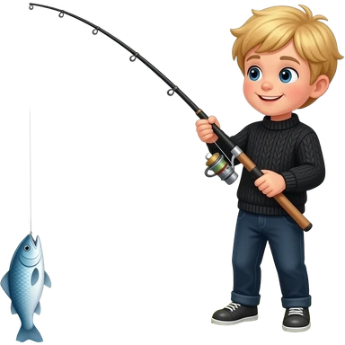 a small blonde kid with black sweater and pants and a massive fishing rod reeling in a fish from the shoreline emoji