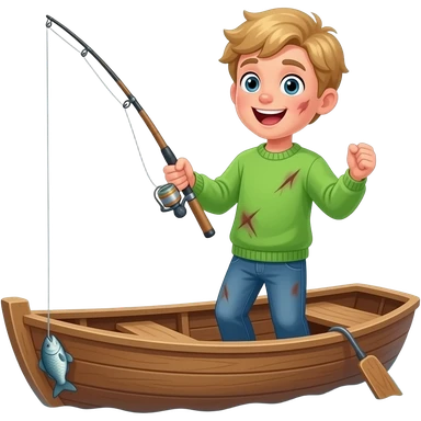 a young teenager with a green sweater and dirty blonde hair on a boat so excited to catch a fish emoji
