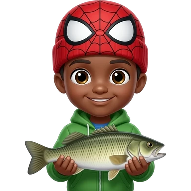a small black kid ,with a spiderman beanie and a green jacket holding a bass fish emoji