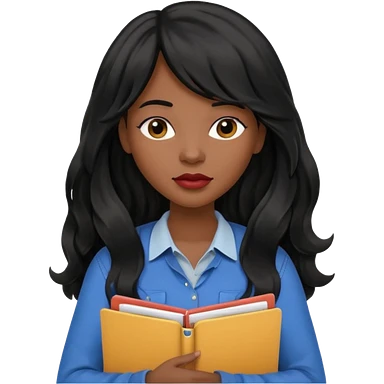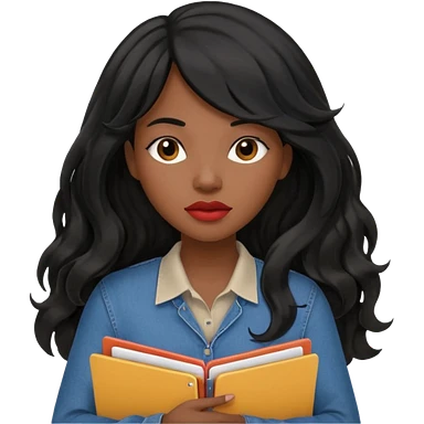 A young woman with long black hair, a wavy frange falling on half of her head. She's black, medium to dark skinned with thick lips. She's holding folders, because she's a CEO, but she's wearing casual clothes. emoji