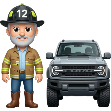 Ford bronco Cartoon emoji-style grey haired man in jeans, cowboy boots, and a firefighter helmet with 12 on the front standing next to marsh gray colored 2025 ford emoji