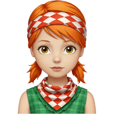 girl orange hair, wear red and white checkered bandana, green dress emoji