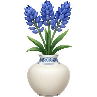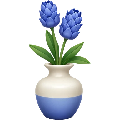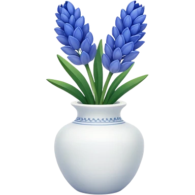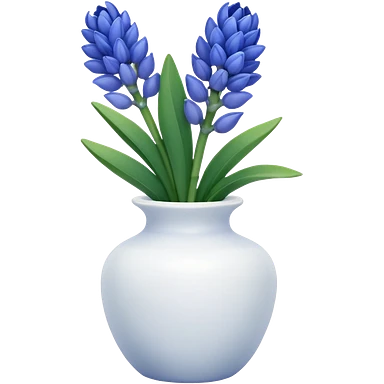 A small white vase holding a single blue hyacinth flower with green leaves. emoji