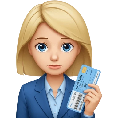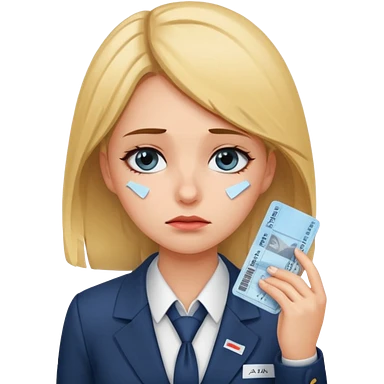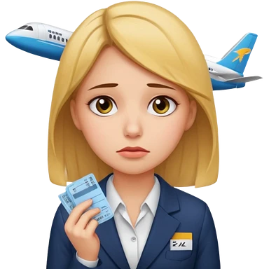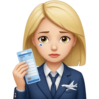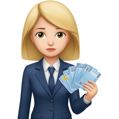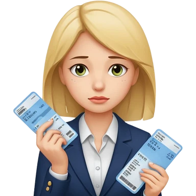Девушка в офисном костюме, грустная, с билетами на самолет в руках emoji
