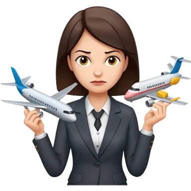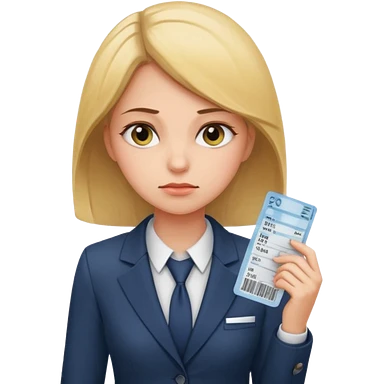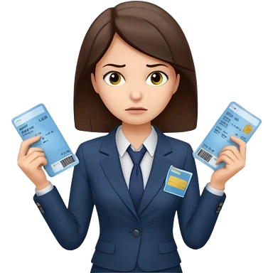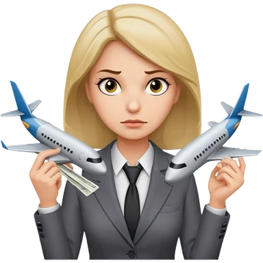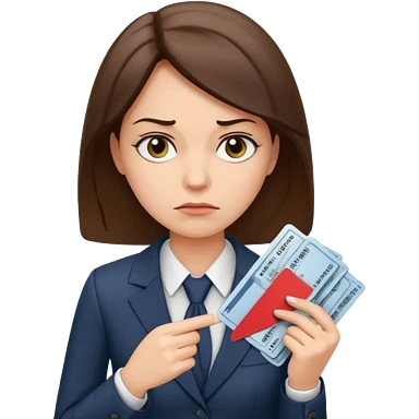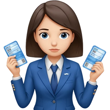 Девушка в офисном костюме, хмурая, с билетами на самолет в руках emoji