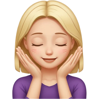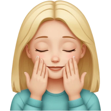 Девушка довольная своей кожей и состоянием. Руки ладонями касаются щек. Глаза закрыты, на губах улыбка emoji
