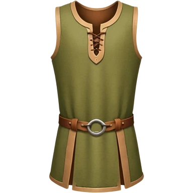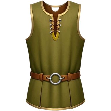 A stylized 3D render of a sleeveless medieval tunic, olive green fabric, scoop neck with a small keyhole opening fastened by brown leather toggles. emoji