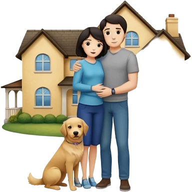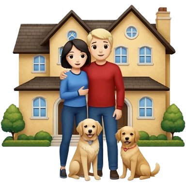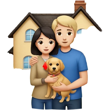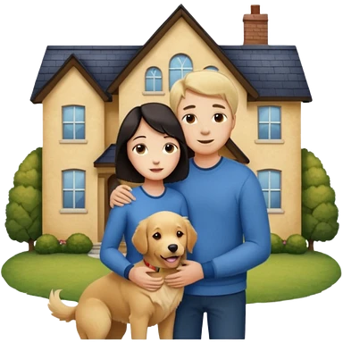 Девушка с тёмными короткими волосами стоит на фоне большого дома рядом с ней мужчина со светлыми волосами обнимаются рядом собака emoji