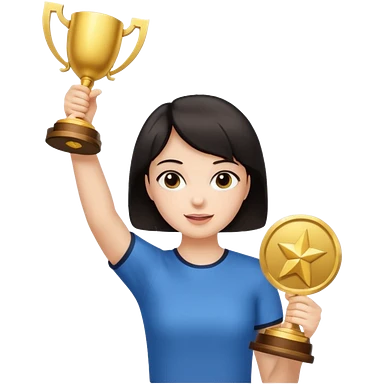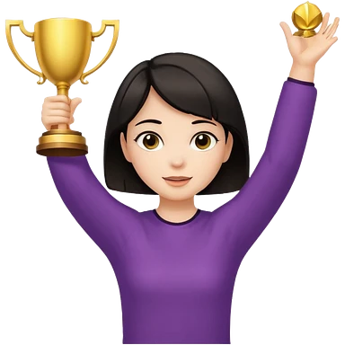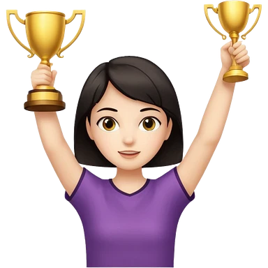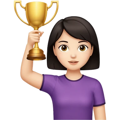 Девушка с тёмными короткими волосами с поднятыми вверх руками с кубком emoji