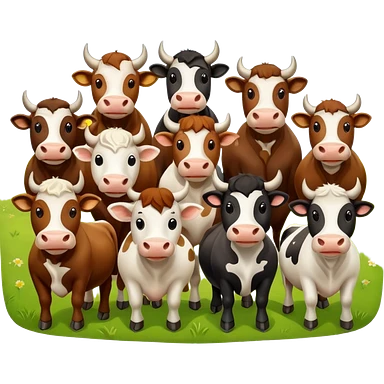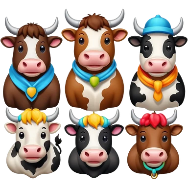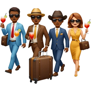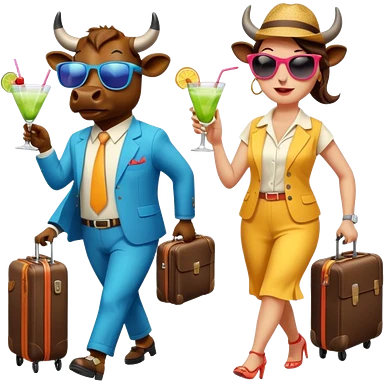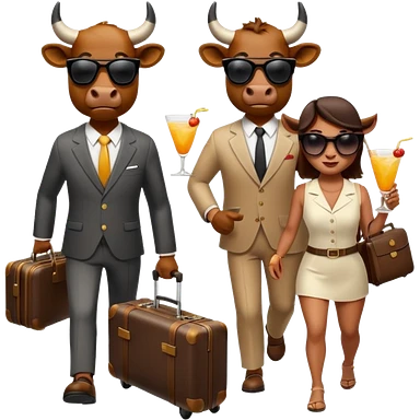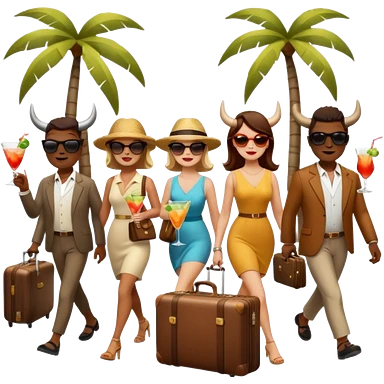 generate an emoji of a group of up to 8 male and female bulls travelling together on holidays. One bull has a suitcase, one has sunglasses, one is carrying a cocktail. They're all in motion, walking together. Make the characters look like bulls emoji