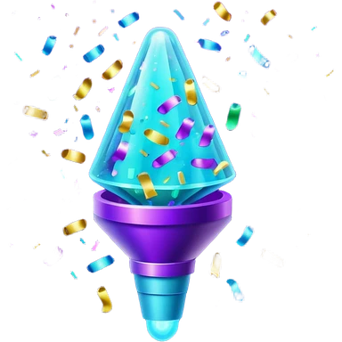 Futuristic glowing confetti popper emoji, holographic purple and cyan colors, emitting confetti and sparkles, dark background, vibrant celebration atmosphere, no face. emoji