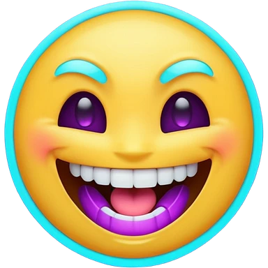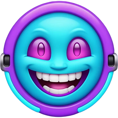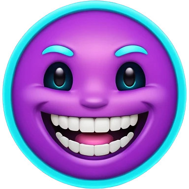 futuristic glowing emoji face laughing wide with glowing teeth, purple and cyan neon light, dark background emoji