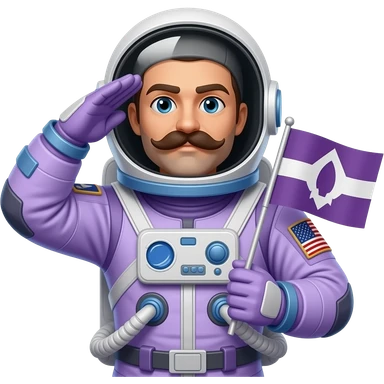Emoji de um astronauta meio roxo dando saudação para alguém. A bandeira no braço precisa ser algo comoo simbolo da rocketseat Mas é preciso que seja um astronauta de bigode , bigodão e o traje roxo mesmo, Não tenha simbolo na roupa emoji