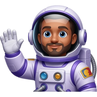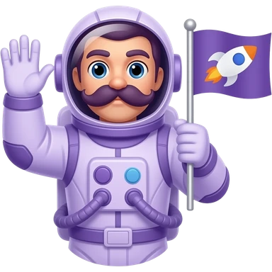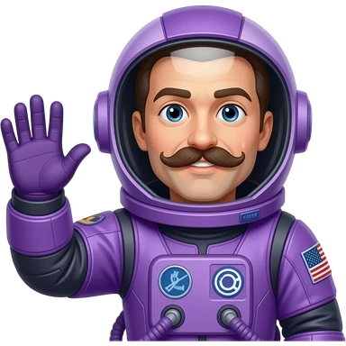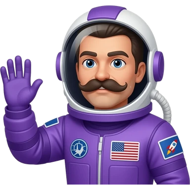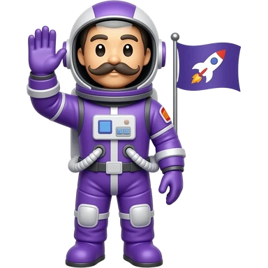 Emoji de um astronauta meio roxo dando saudação para alguém. A bandeira no braço precisa ser algo comoo simbolo da rocketseat Mas é preciso que seja um astronauta de bigode , bigodão e o traje roxo mesmo, Não tenha simbolo na roupa Seja só o busco do astronauta emoji