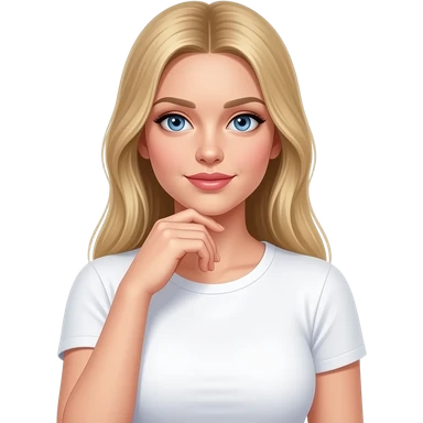 ragazza russa bionda occhi azzurri capelli lisci lunghi, seno prosperoso titubante mano sotto il mento maglietta bianca emoji